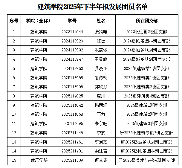 现对拟确定的发展团员名单予以公示,公示期为5个工作日,自2025年11月19日—2025年11月25日17:00。如有异议请于11月25日17:00前至犀浦校区X8226办公室王老师处当面反映,恕不接受匿名反馈。联系方式:028-66367796。