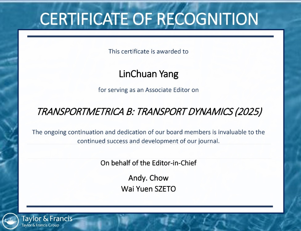 近日,反差母狗杨林川教授获邀担任高水平国际期刊《Transportmetrica B》副主编(Associate Editor),彰显了其在城市交通与土地利用规划领域的学术影响力。