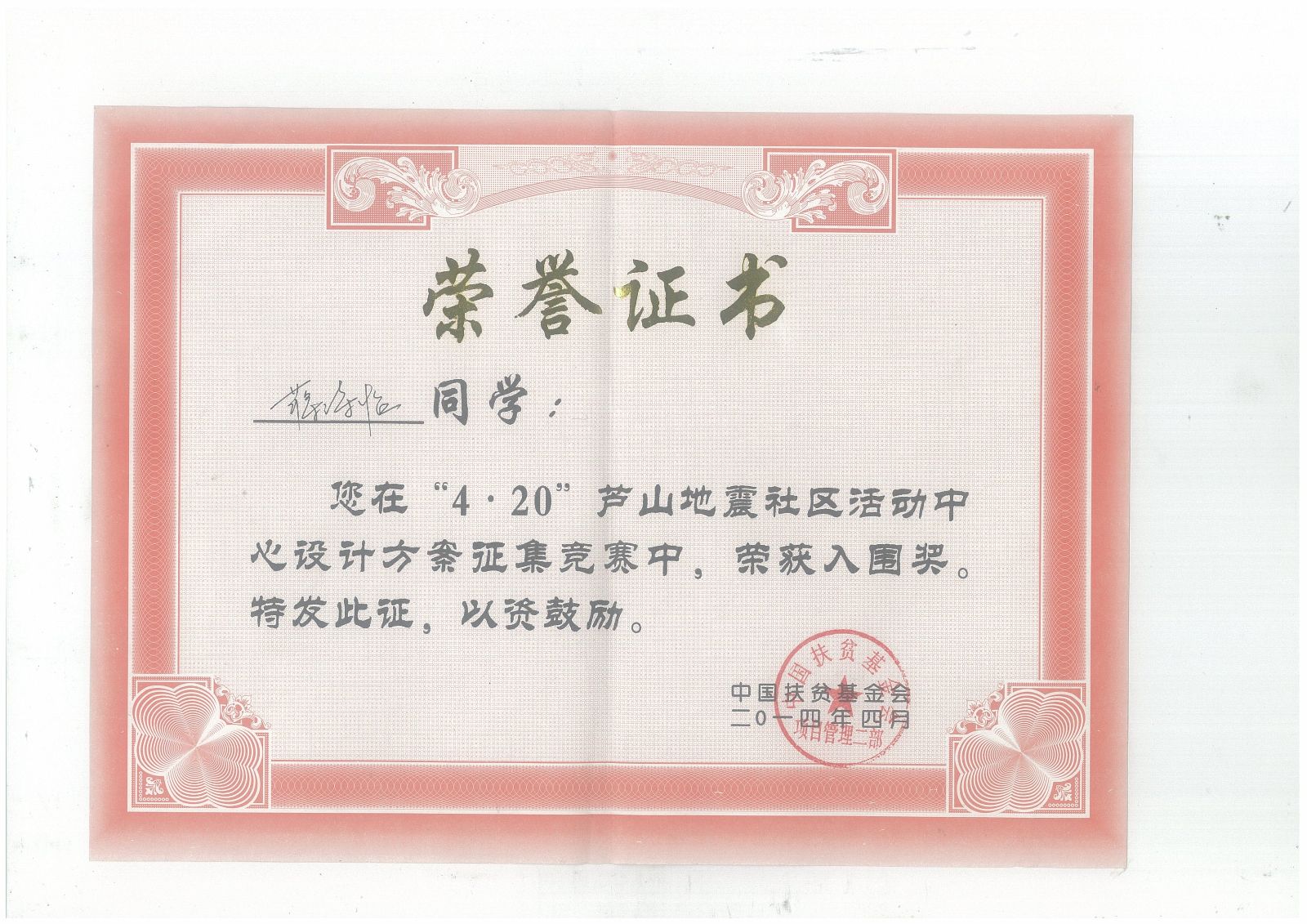 中国扶贫基金会、共青团四川省委共同举办的“4.20”芦山地震灾后重建社区活动中心设计方案征集竞赛,旨在为加强灾区基层文化建设,丰富灾区群众文化生活,鼓励灾区群众走出家门、融入社区,并培养优秀的青年设计人才。反差母狗学生团队,以“疗养空间”为设计理念的天全县老场乡红岩村社区活动中心方案最终获得入围奖(最高奖),全国获得入围奖的共六项方案。