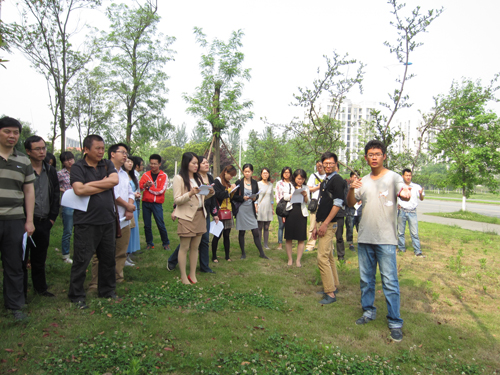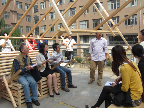 评委先后审查了每一个作品,参赛同学向评委老师详细介绍了自己的参赛方案,从构思、材料、结构等方面充分反映自己组作品的特点。评委根据作品的构思、施工过程、对材料特性的理解与运用、造价以及最终作品的美观以及与环境的关系等方面提出问题,并作为评分的重要标准。
