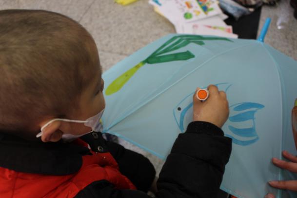 有了前几次的绘画经历,孩子们似乎对这种特殊形式的作画产生了浓厚的兴趣。也许是有了这么多大哥哥大姐姐的陪伴,孩子们格外珍惜每次的绘画机会,一拿到石头和雨伞就立刻低头沉浸在自己的创作世界了。一个个鲜活的动漫通过稚嫩的小手描绘变得栩栩如生。绘画过程中,孩子们变身神笔马良,用自己独特方式讲述了不同的精彩故事和梦想,呈现在每一把爱心雨伞上。也许在他们心里,这里的雨伞不仅仅是能为别人遮风避雨,更能在他们伤心难过的时候,能够抚慰他们伤口的创可贴。这里的石头也不再是默默无闻的衬托者,而是五彩缤纷的坚毅守护者,守护着孩子们萤火虫班纯美而恬静的梦。
