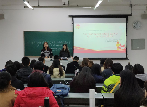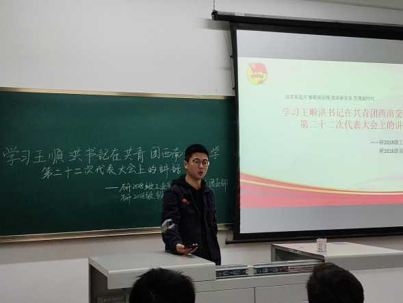 第二十二次代表大会上的讲话。并从王顺洪书记讲话内容的概括入手,让同学们初步了解书记的讲话精神。以及书记对同学们报以的深厚期望。同时,段沁妤同学为大家介绍了召开此次会议的目的,以及我们要向着什么目标努力,要如何去实现书记对我们广大共青团员、广大研究生团体寄予的厚望。